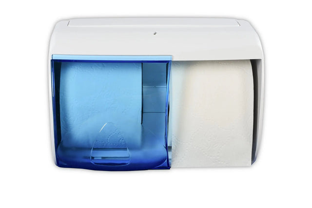 Dieser Spender ist für den Gebrauch von zwei normalen Toilettenpapierrollen geeignet. Sobald eine Rolle aufgebraucht ist, wird die Abdeckung einfach zur Seite geschoben und die nächste kann verwendet werden. Der elegant wirkende Spender ist aus einem hochwertigen Kunststoff hergestellt und besitzt abgerundete Ecken und Kanten. Die Farben sind Weiß und ein transparentes Blau für die Abdeckung. Mit dem beigefügten Montagematerial können Sie diesen Toilettenpapierspender schnell und einfach montieren.